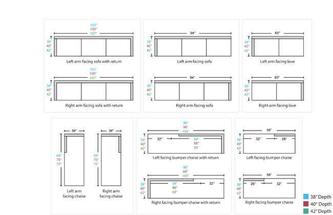 | 1 arm sofa with return | 103/105/107 | 38/40/42 | 36 | 18.5 |
