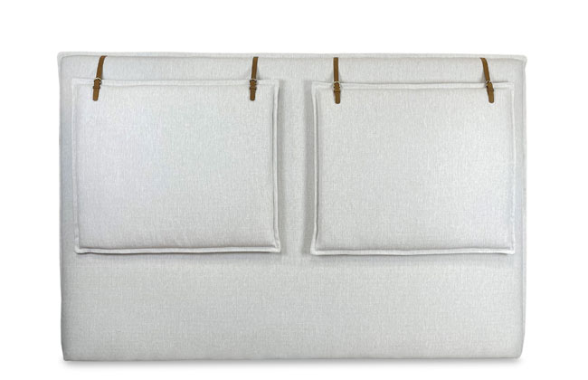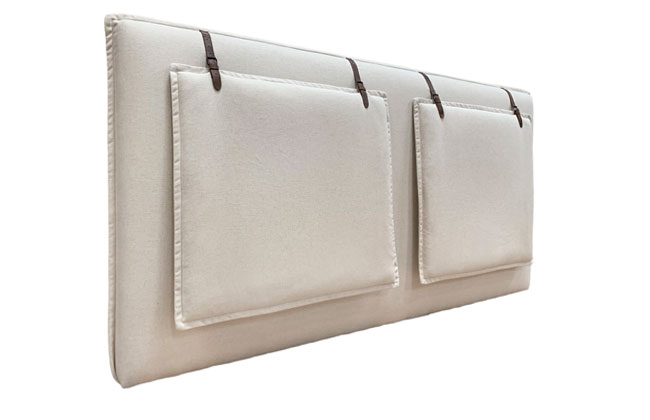 This wall mount headboard features 3/4" flange seams and two decorative cushions. These cushions are attached with leather straps. The headboard and cushions are covered with fabric front and back.