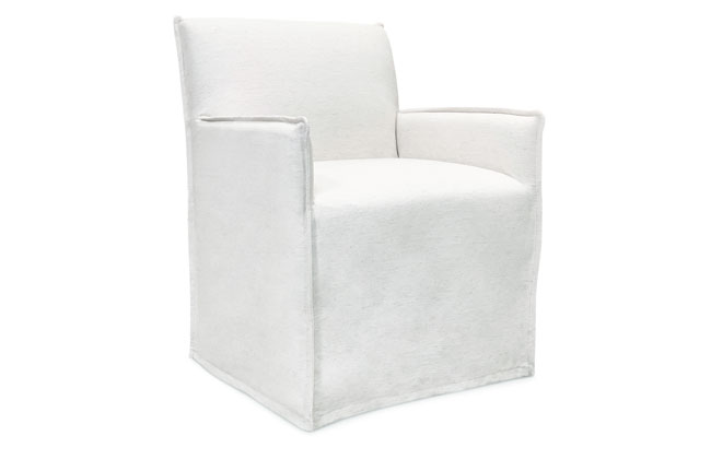 This chair features flanged seams, an upholstered slipcover, and arms.